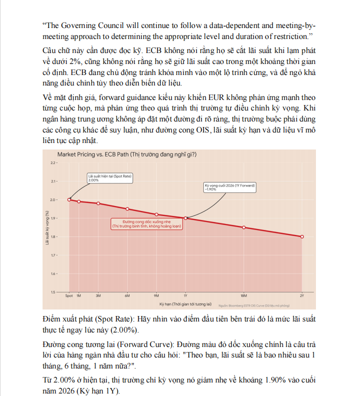 Trước hết là lạm phát và chính sách. Theo các dự phóng mới nhất, lạm phát HICP của Eurozone được đưa về khoảng 1.9% trong năm 2026, trong khi lãi suất tiền gửi của ECB giữ ở mức 2.00%. Hai con số này đặt cạnh nhau cho thấy một điều khá quan trọng: ECB không còn ở trạng thái phải phản ứng gấp gáp. Điều này cũng thể hiện rất rõ trên đường OIS, khi thị trường chỉ price khả năng điều chỉnh nhẹ, không còn câu chuyện cắt mạnh. Đây là lớp dữ liệu nền mà trong các báo cáo gửi client, người làm macro luôn phải chốt trước khi bàn tới FX.