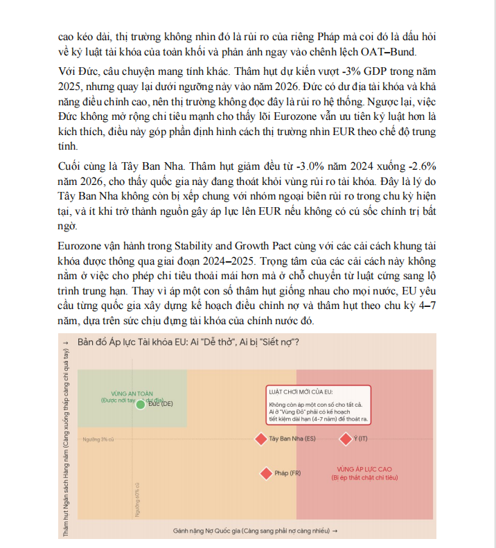Sang trụ tài khóa và trái phiếu, báo cáo không nhìn vào chi tiêu bao nhiêu, mà nhìn vào spread. Dữ liệu cho thấy BTP–Bund quanh 0.7%, Spain–Bund dưới 0.5%, trong khi OAT–Bund của Pháp nằm ở vùng nhạy cảm hơn. Những con số này được dùng để luận giải rằng rủi ro phân mảnh chưa bị định giá lại, nhưng chỉ cần spread mở nhanh, cách thị trường nhìn EUR sẽ đổi ngay. Đây là cách đọc rất quen thuộc trong các báo cáo FX–Rates gửi khách hàng tổ chức, vì spread phản ánh rủi ro thực tế nhanh hơn rất nhiều so với các tiêu đề tin tức.