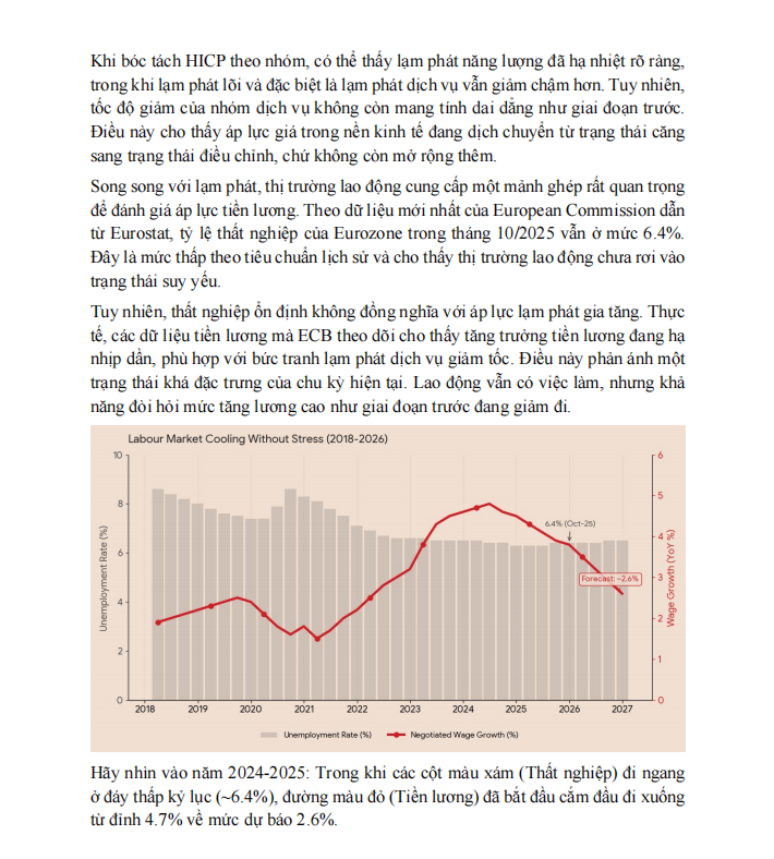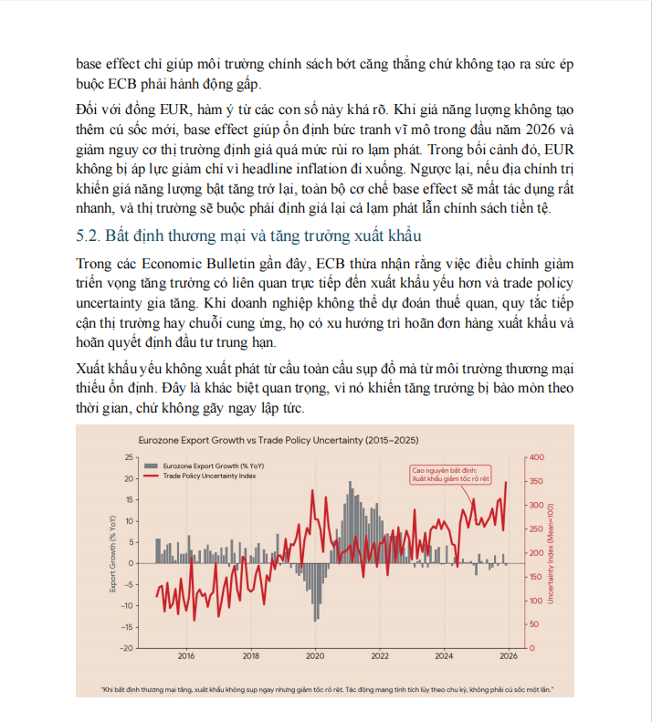 Tuy nhiên, nếu chỉ dừng ở chính sách thì vẫn chưa đủ để hiểu EUR. Phần tiếp theo trong báo cáo tập trung vào QT và thanh khoản hệ thống. ECB đã chấm dứt tái đầu tư PEPP từ cuối 2024, APP cũng dừng trước đó. Bảng cân đối vì vậy co lại theo cách thụ động, kéo theo excess liquidity giảm dần theo thời gian. Quá trình này không gây sốc, nhưng kéo dài liên tục. Trong các report thường niên, đây là dữ liệu rất quan trọng vì nó thay đổi điều kiện tài chính một cách âm thầm, và FX thường phản ứng với điều này trước cả khi dữ liệu kinh tế đổi màu.