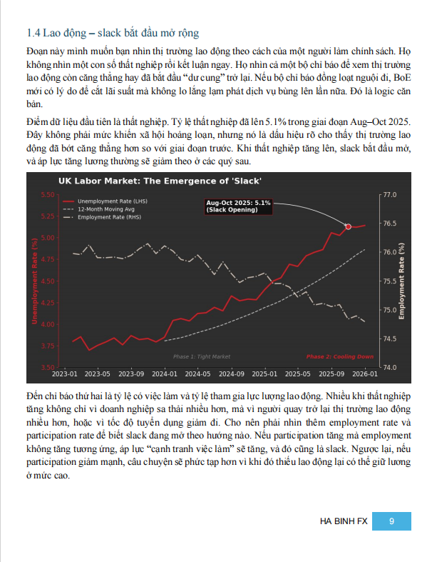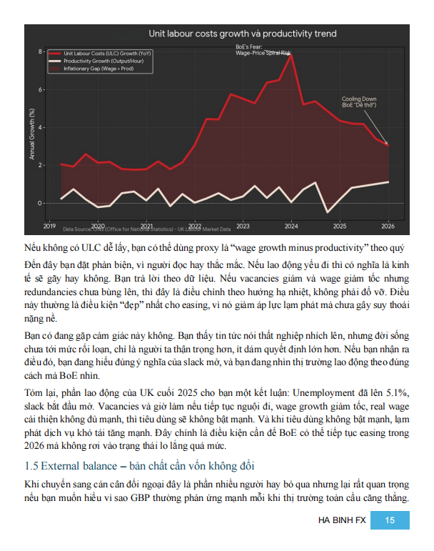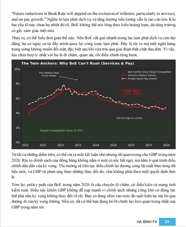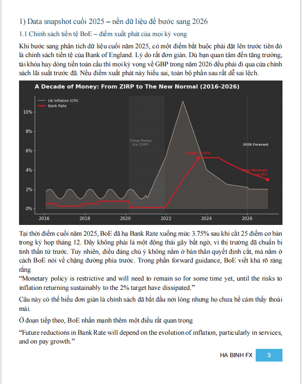 Khi đặt toàn bộ dữ liệu cuối 2025 lên bàn, điều cần làm rõ ngay là: năm 2026 của GBP không phải câu chuyện kinh tế Anh tốt hay xấu, mà là câu chuyện mặc cả giữa nhiều lực kéo cùng lúc. Chính sách tiền tệ đã bắt đầu nới lỏng, nhưng không thể đi nhanh. Tăng trưởng yếu kéo dài, nhưng chưa gãy. Tài khóa tạo áp lực lên lợi suất. Và trên hết, GBP vẫn bị chi phối mạnh bởi trạng thái dòng tiền toàn cầu.