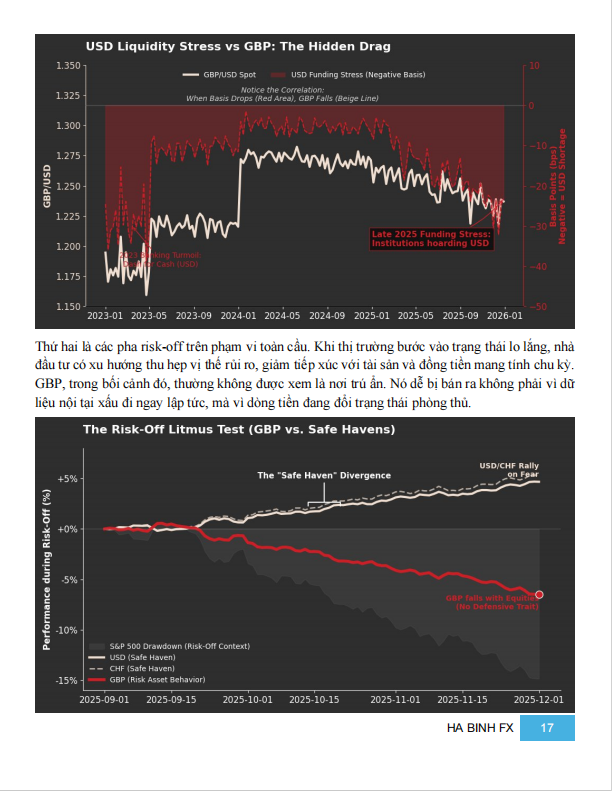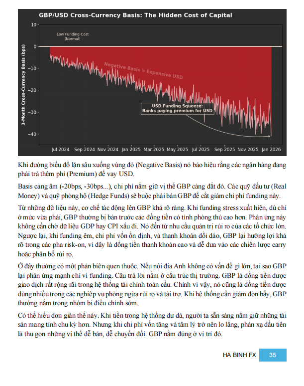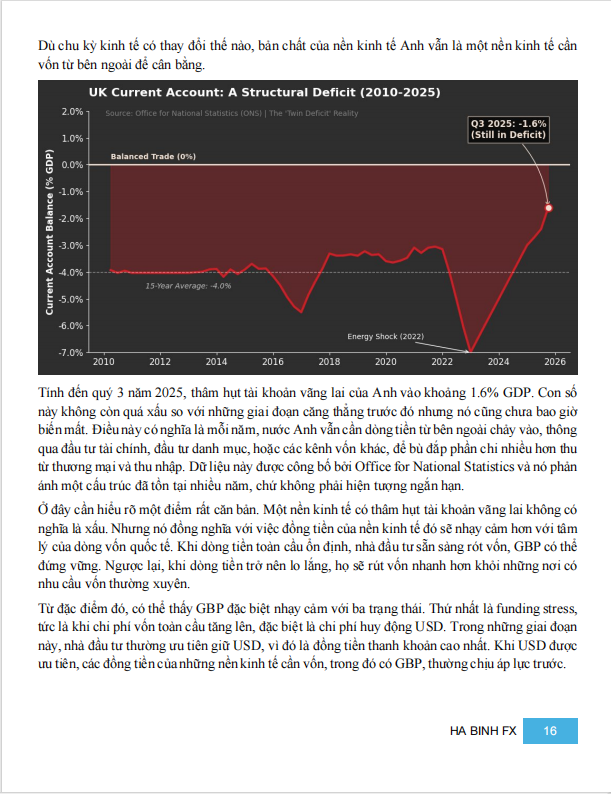 Cuối cùng là yếu tố cốt lõi: UK vẫn là nền kinh tế cần vốn từ bên ngoài, với thâm hụt tài khoản vãng lai quanh 1.6% GDP. Điều này khiến GBP rất nhạy với funding stress, đặc biệt là chi phí vốn bằng USD. Khi USD trở nên đắt hơn, hoặc cross-currency basis xấu đi, GBP thường bị điều chỉnh sớm, ngay cả khi dữ liệu nội địa chưa đổi.