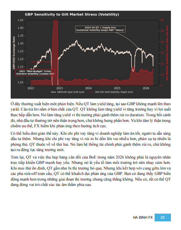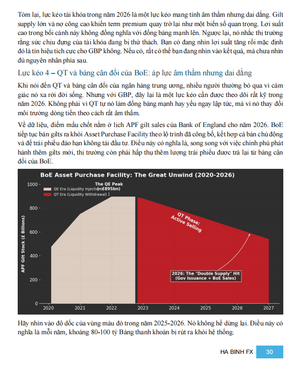 Bên dưới nữa là QT của BoE. Lịch bán gilts và không tái đầu tư khiến mỗi năm 80–100 tỷ GBP thanh khoản bị rút khỏi hệ thống. QT không đánh trực diện vào tỷ giá, nhưng làm môi trường nhạy cảm hơn. Khi trùng với các pha risk-off toàn cầu, GBP thường phản ứng mạnh hơn mức nhiều người kỳ vọng.